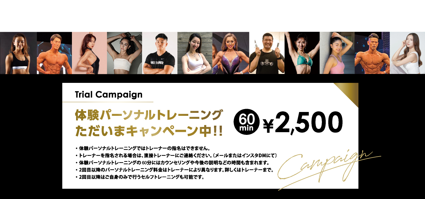 初回は体験パーソナルトレーニング2,500円(60分)にて承っております。